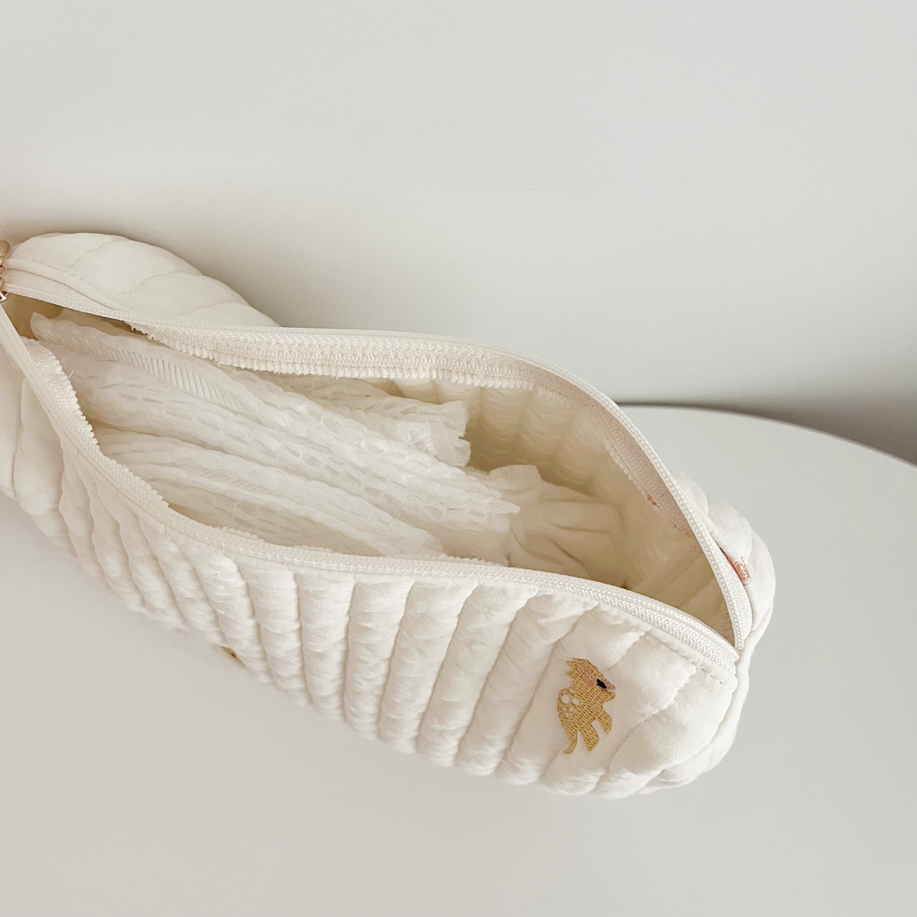 小さくかわいい恐竜刺繍のイブル生地を使用した、キュートなおむつポーチ。