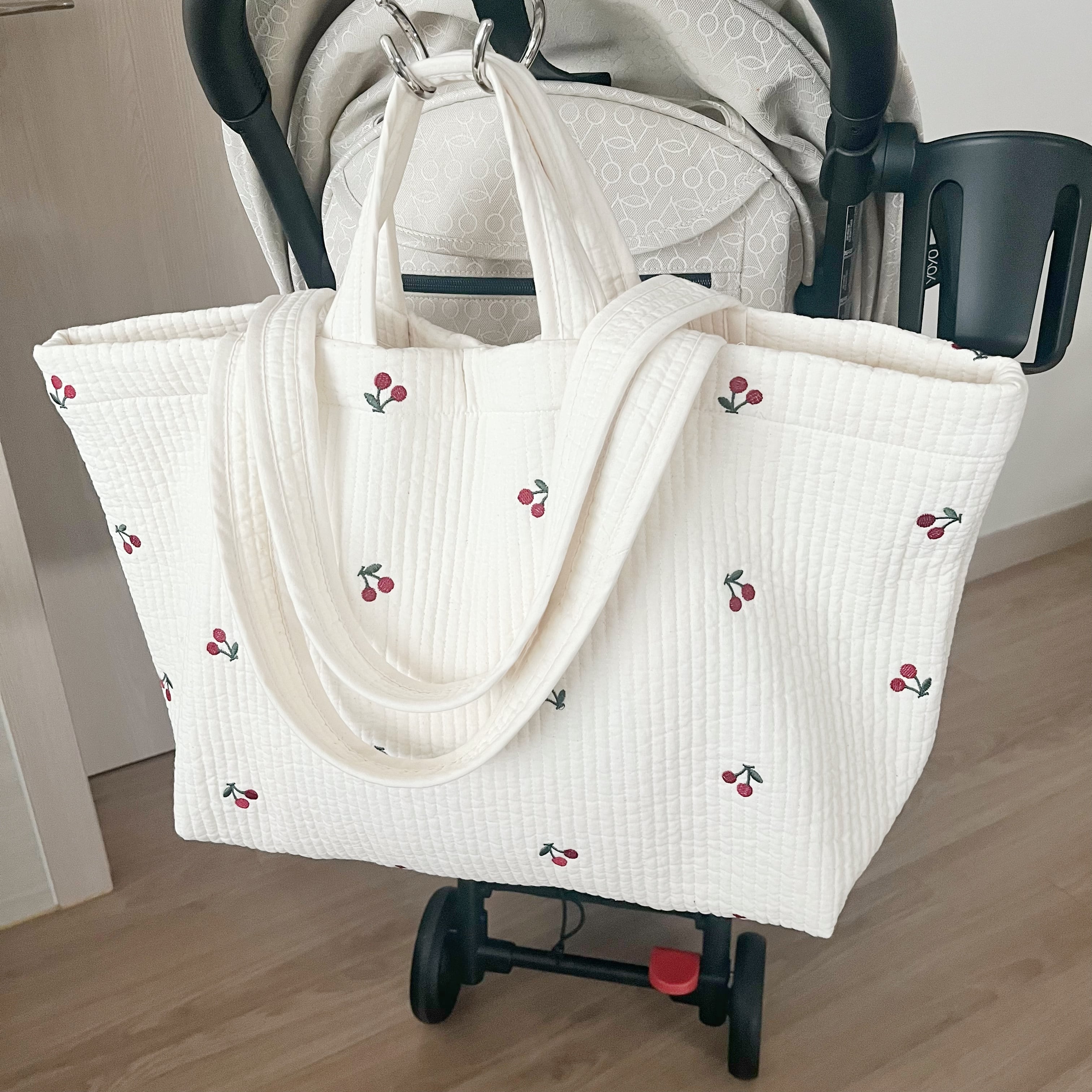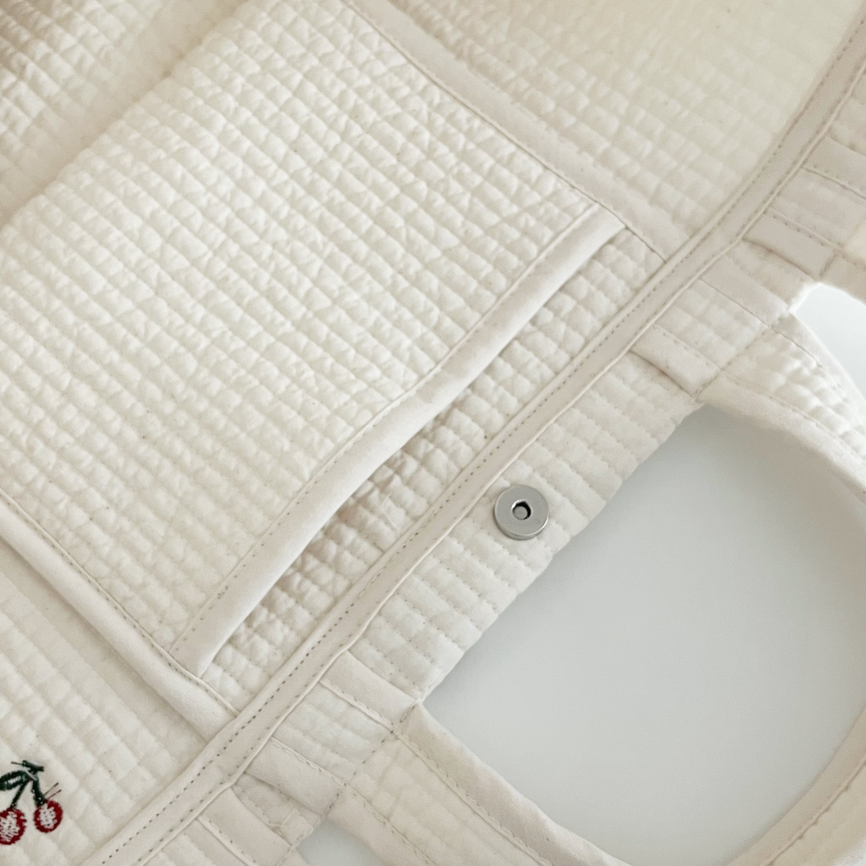 キルティング生地を使用し、チェリーの刺繍がキュートなヌビトートバッグ。